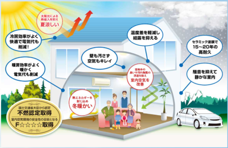 さらに室内の空気をキレイにしたり、結露や騒音の抑制など、生活の不安・不満を解消する事が出来る画期的な塗材です。